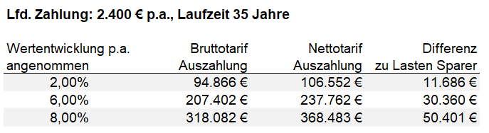 Jede Versicherung enthält Kosten für den Versicherer und für den Vermittler. Dies gehen zu Lasten des sog. Sparanteils, reduzieren also die mögliche Ablaufleistung für den Versorgten.